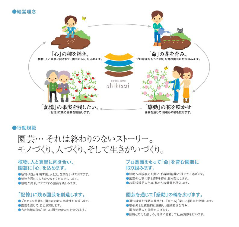 会社概要 称号 :株式会社 四季彩名称 :ガーデンセンター四季彩設立 :平成13年8月7日代表者 :竹内 育美資本金 :500万円所在地 :徳島県板野郡板野町大寺字大向北88-1TEL :088-672-6556事業内容:野菜苗、花苗、園芸資材の販売